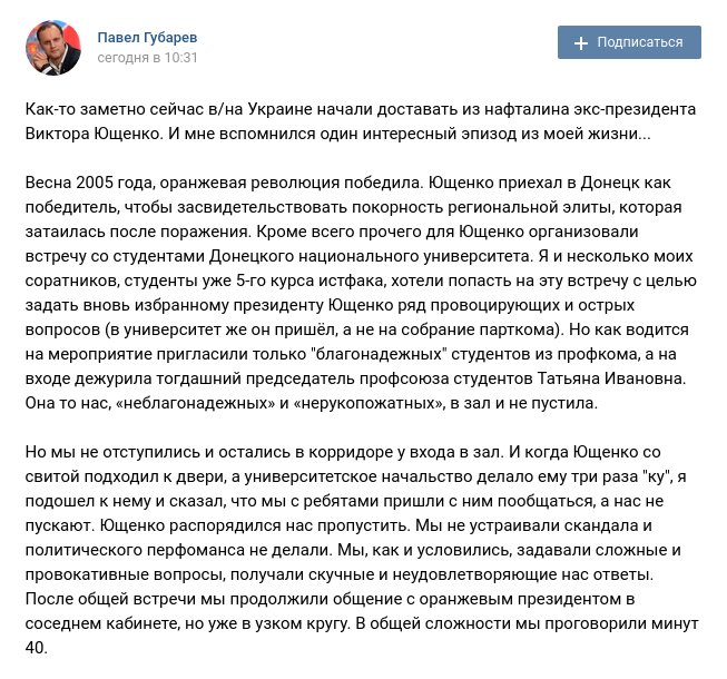 Как же я ненавижу эти массовые травли, да еще и в угоду Кремлю. У меня тоже были когда-то свои претензии к нему, но зато сейчас я понимаю, что была неправа. Ющенко тогда - в 2005 знал несомненно больше, чем мы все, но не мог сказать, потому что по ВР лазили разные фрики с шариками "НАТО - нет", и никто не верил, что путин способен начать войну с Украиной, а Ющенко об этом знал, поэтому и склеивал эту страну как мог. Россия вбухала в Яныка на тех выборах миллиард долларов и готова была на всё. Мы очень мало знаем о том, что тогда происходило. Недавно смотрела одно интервью Пасхавера и он там сказал, что ему лично Чубайс еще в 90-е сказал, что "мы вас всех купим".