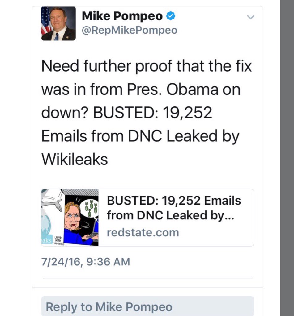 Несмотря на то, что Майк Помпео втихаря посещал Москву в прошлом году, а во время выборов распространял и пропагандировал взломанные российскими хакерами материалы о Хиллари из Wikileaks, являющегося анафемой для любого уважающего себя разведчика, Помпео все же не дурак, чтобы не понимать, что происходит в данный момент. Конечно же, он поддержал коллег из раведсообщества. Они все заявили, что имеют противников, готовых к агрессии — это Россия, Китай, Иран и Северная Корея, от которых США ожидают кибер-угроз в следующем году. Россия, вероятно, будет самой способной и агрессивной, и будет продолжать свои усилия по распространению ложной информации, и использовать другие средства влияния как открыто, так и скрыто, чтобы попытаться усугубить социальные и политических трещин в Соединенных Штатах. Полностью текст здесь.